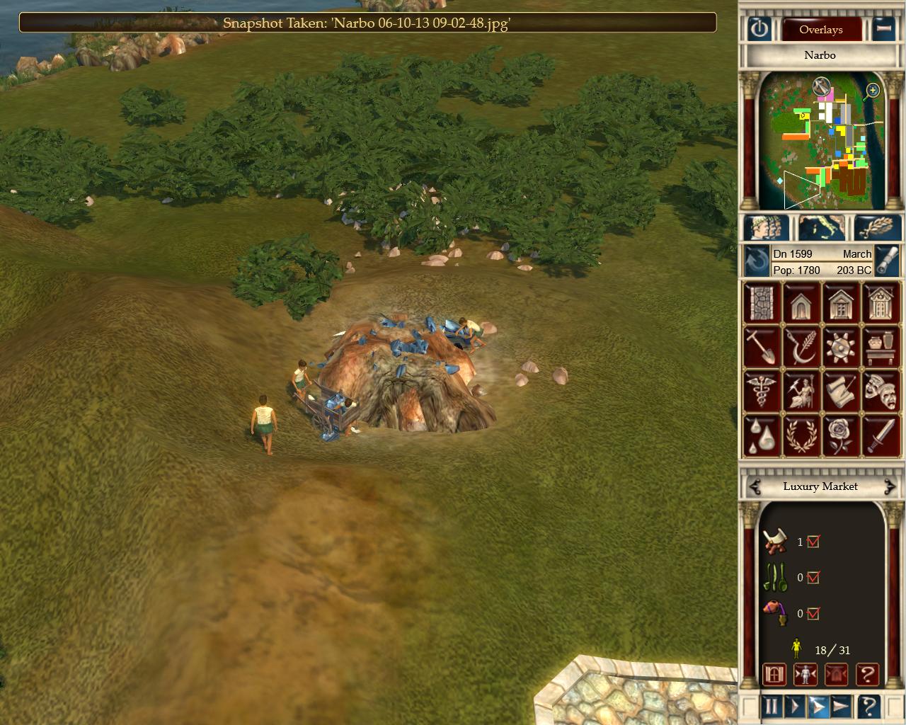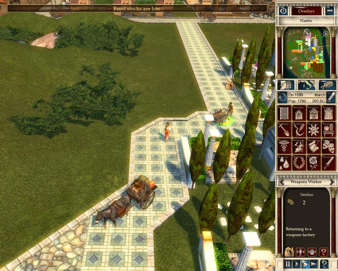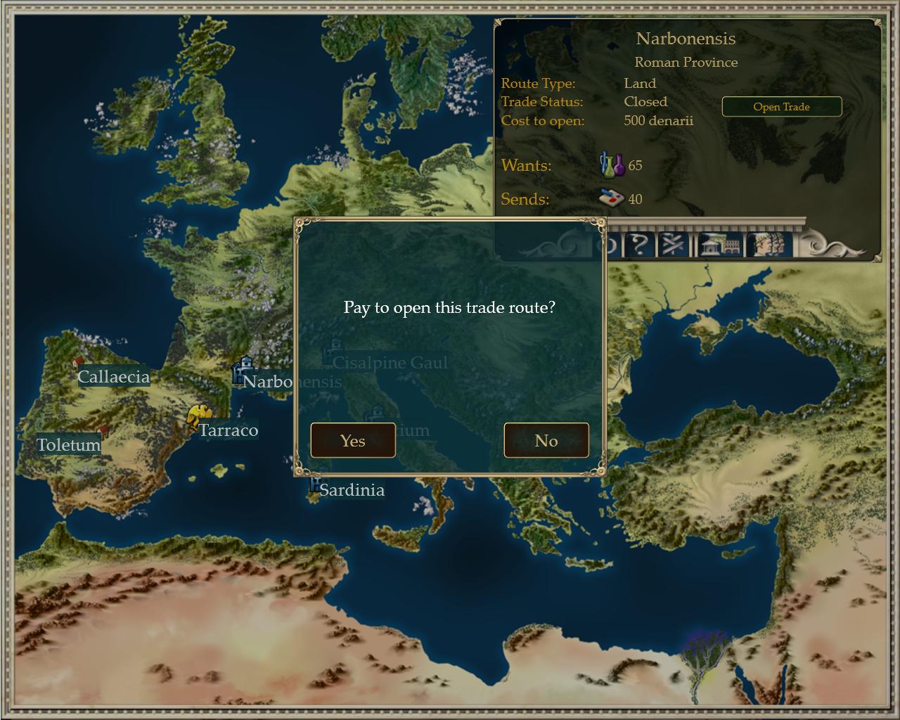 A harmadik és legjövedelmezőbb persze a kereskedelem. A birodalom egyéb városaival kialakíthatunk kereskedelmi útvonalakat, s minden városnak szüksége van valamilyen termékre vagy el tud adni belőle. Érdemes a legelején megnézni, hogy mi az a termék, amit könnyen elő tudunk állítani és lehetőség szerint nagyon sok kell belőle valamelyik városnak, mert ha már az első év végén tudjuk teljesíteni a kvótákat, akkor nem nagyon lesz később anyagi gondunk.