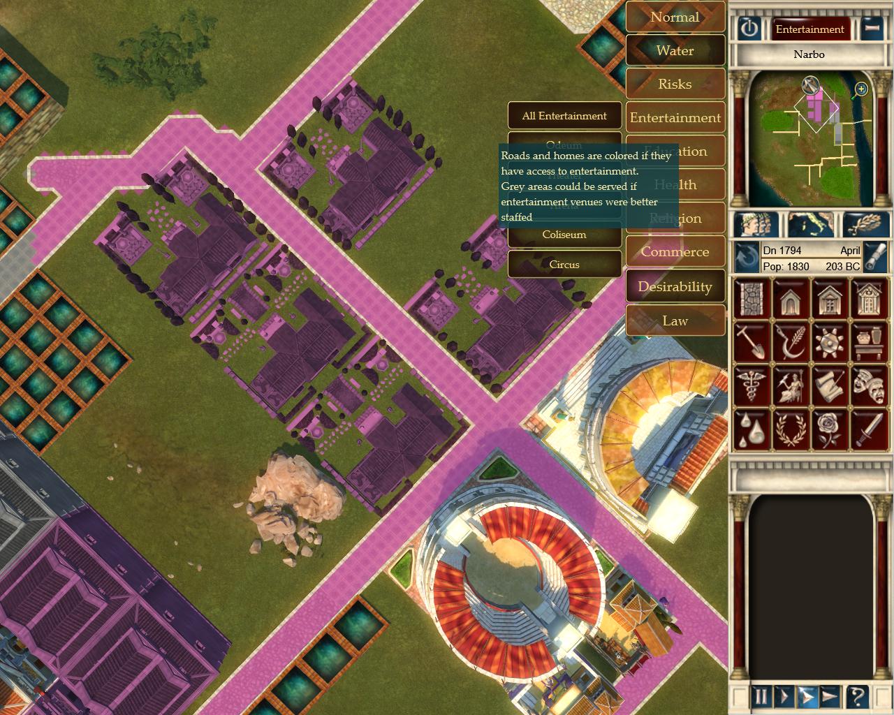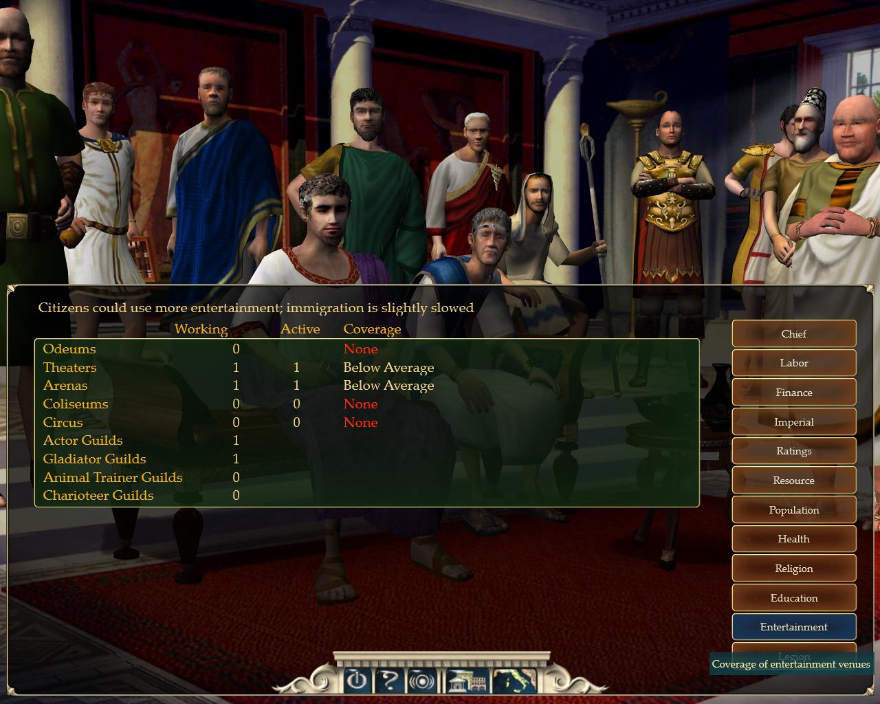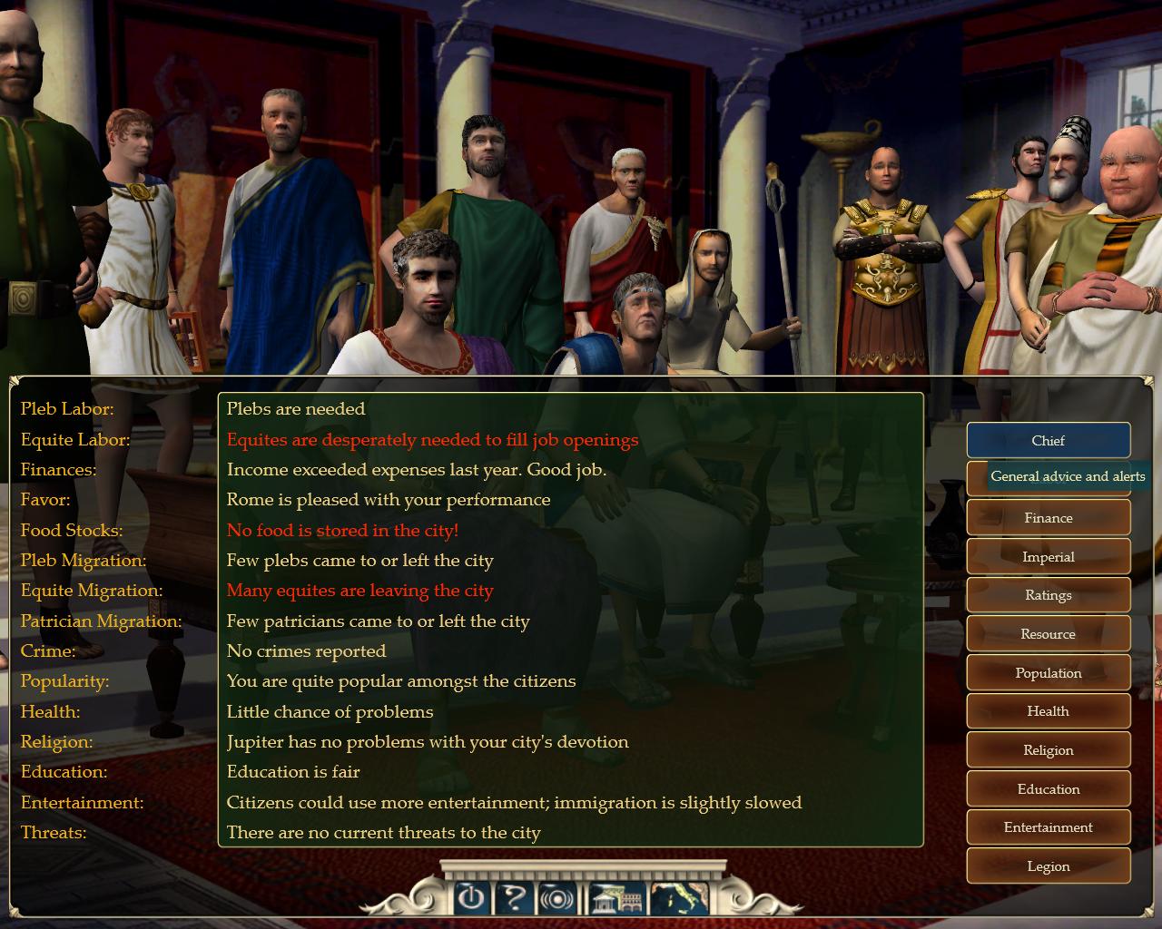 Miután letudtam a kötelező szidalmazást, ami megkormozta az egyébként nagyon is kellemes játékcsodát, lássuk miből is válogathat az önjelölt városrendező. A birodalmat benépesítő lakosokat három osztályba sorolták, mégpedig plebs, polgárok (egyenlők) és patríciusok. A legalsó kaszt természetesen a kétkezi munkásokat adja, ők kapálnak, faragnak, öntenek, vésnek, kaszálnak, egyszóval mindent, amit ma iparnak és mezőgazdaságnak nevezünk. Számukra az élelmen kívül csupán alapvető árucikkekre van szükség, nem dőzsölnek. A középréteg a szolgáltatásokért felelős, mint a szórakoztatás, a vízvezetékek, az oktatás, vallás és egyebek.