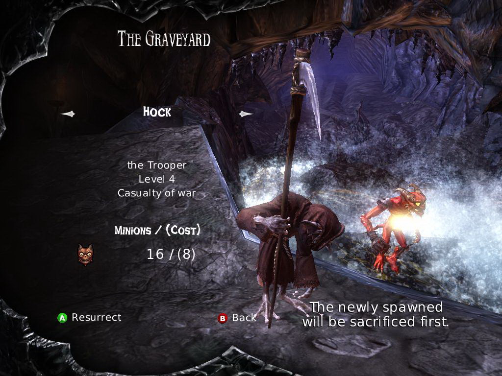 Ezeknél a barakkoknál található a játék egyik leghasznosabb újítása, a Temető (Graveyard). Itt nézhetjük meg az elhunyt hősi katonáinkat, látva, hogy miben és milyen szintűként hunytak el, és hogy hány friss, még élő kollégára van szükségük ahhoz, hogy újra a szolgálatunkban gonoszkodjanak. Bizony, kedvenc feltápolt minionjainkat friss társaik (értsd első szintű zöldfülű) életéért cserébe visszahozhatjuk a halálból. A ráfordítandó mennyiség a feltámasztandó minion szintjétől függ, értelemszerűen minél magasabb szintű gremlinünk, annál több életet követel a sajátjáért.