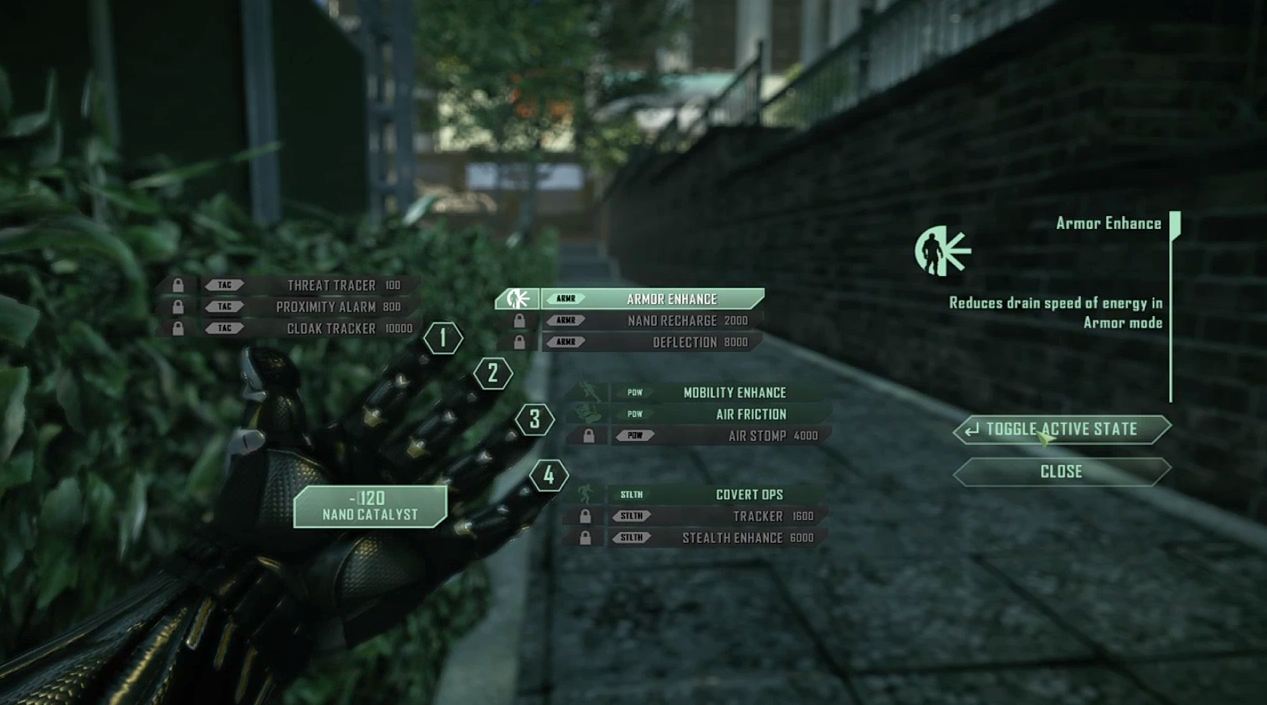 A harmadik és egyben kérdőjeles mód a tulajdonképpeni hőkamera, amelyet elég ritkán - tulajdonképpen egyszer sem - fogunk használni, lévén nem lesz rá szükségünk. Ezeknek a különleges tulajdonságoknak köszönhetően nagyon sokféle taktikai lehetőségünk lesz egy-egy összecsapás során. Lehetünk csendes gyilkosok a láthatatlan móddal, de a páncéllal előhívott részleges halhatatlanságnak köszönhetően újraélhetjük gyermekkorunk Terminátor filmjeinek élményét is. Ezeket ötvözve pedig további stratégiákat dolgozhatunk ki - csak mindig tartsuk a szemünket az energiaszinten -, de ha mindez nem lenne elég, a nanoruhát immáron fejleszthetjük is.