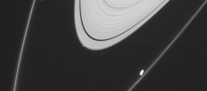 A világos folt a Prometheus hold a vékony F-gyűrű mellett. A vastagabb gyűrű az A-gyűrű, aminek a csúcsánál látszik némi elmosódás