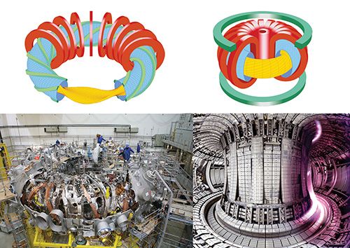 A fenti négy képen bal oldalon láthatjuk a klasszikus sztellarátorok felépítését, jobb oldalon pedig a tokamakokét. A felső két kép mutatja, hogy milyen alakja van a plazmának és a tekercseknek, illetve ezek hogyan helyezkednek el. Az alsó két képen láthatunk két valós berendezést, jobb oldalon az angliai JET belseje látható, amely a legnagyobb tokamak típusú fúziós kísérleti berendezés a világon. A bal oldalon a korábbiakban bemutatott W7-X nevű sztellarátor látható. A W7-X-et tartják a világ legbonyolultabb fúziós berendezésének, illetve a "sztellarátorvilág JET-jének", mérete és amiatt, hogy a következő lépésben egy erőmű méretű berendezés is épülhetne a jövőben, ha a kísérletek kedvező eredményekkel zárulnak. Magyar kutatók a Wendelstein 7-X kísérlet mellett a világ több más vezető fúziós berendezésén is építenek és üzemeltetnek hazai fejlesztésű mérőberendezéseket.