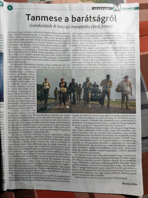 A szombati mozi nap legfeleslegesebb filmje volt. 5000 kilométer séta és csak végtelen beszélgetés a semmiről. Hangulatot nem sokat kölcsönöz, hogy milyen kedvesek egymással a srácok és bajtársiasak. A vége meg szar. És állítólag ez King egyik legjobb könyve. Hát lehet, hogy könyvben ez működik... -