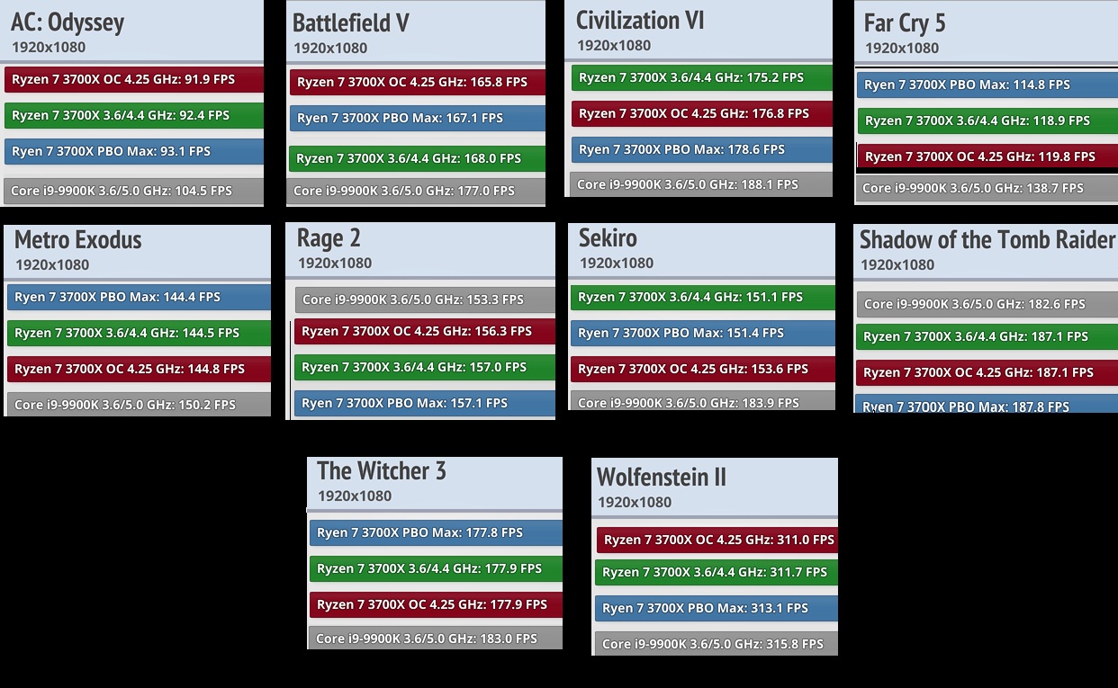 "Végül, de nem utolsó sorban a játékok. Ezen a területen ugyancsak egyértelmű volt a Ryzen első és második generációjának hátránya, amin az új széria sokat javított. Az AnandTech által kipróbált címek alapján bár az Intel az esetek többségében továbbra is vezet, előnye már csupán pár százalékos, ami ráadásul leginkább csak alacsonyabb felbontás és részletesség mellett mutatkozik meg. A számok tükrében mostantól gyakorlatilag mindegy, hogy 9000-es Intelt vagy 3000-es AMD-t választ valaki a játékokhoz, szabad szemmel látható különbség gyakorlatilag nincs a processzorok között."