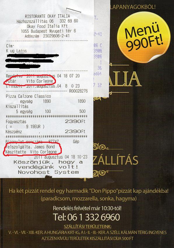 meghozták a pizzám. A számlán lévő nevekből kiindulva nem semmi emberek járultak hozzá az elkészüléséhez.. meg merjem enni egyáltalán? XD