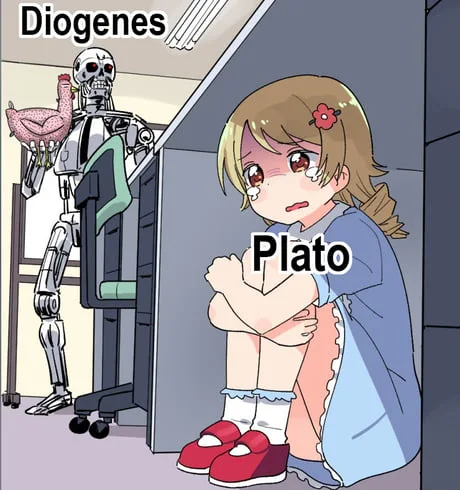 Amikor Diogenész ezt megtudta, akkor elment Platónhoz és tanítványaihoz és közéjük baszott egy megkopasztott tyúkot, miközben így kiáltott: -Íme az emberetek!