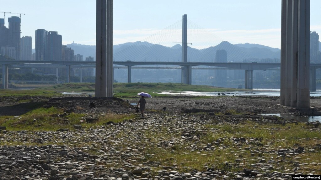 Egy nő átsétál a Jangce folyó medrének Chongqing szakaszán,