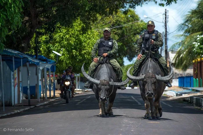 "A brazíliai Marajo -szigeten rendőrök bivalyokon járőröznek az utcákon."