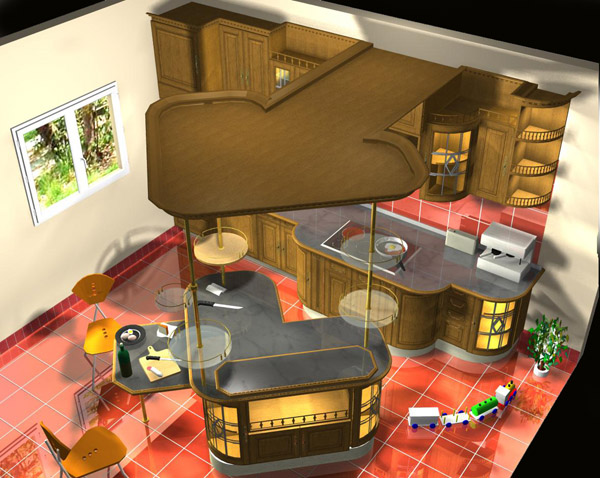 Na eddig jutottam a konyhával, ez amolyan bemutató látványterv, volt szívás vele néhol, de az ilyen bútor nagyon ritka, általában csak egyenes sorok ...