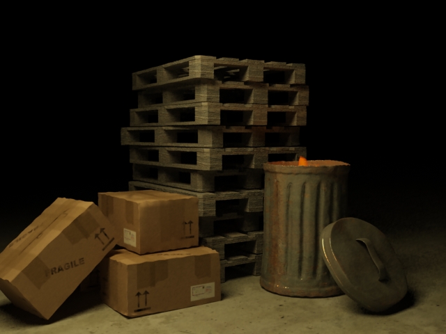 A raklap texturaja is picit nagy, illetve ha jol lattam egy regebbi kepen mintha inverz lenne a bump. Esetleg ha a texturat egy zajos szurke mappal vegyitened (piacon akadnak szinte tok szurke raklapok is, hasznaltsagtol fuggoen), illetve ezeket varialnad, sokat dobna a kepen.