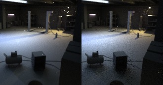 A jobboldali képen a lámpa körül, jobb felső sarokban sokkal kisebb a zaj, az adaptive PPT előnye inkább hosszabb render esetén jön elő, ahol a sima PPT-s képen jellemzően a sok sima, zajmentes felület meleltt lenne egy-két nagyon durván zajosodó pont, pl. caustics. Adaptive PPT esetében ezeket a zajosodó gócokat megkeresi, és oda koncentrálja a mintákat.