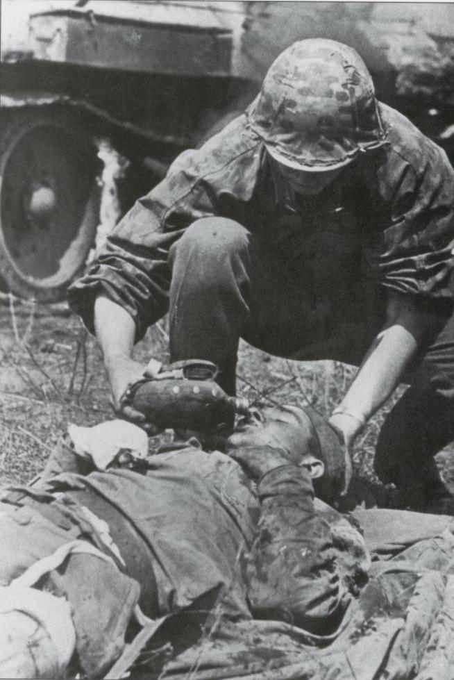 A híresen kegyetlen Waffen-SS. A képen egy Waffen-SS katona segít egy megsebesült orosz katonának(T34-es személyzet egyik tagjának). A saját kulacsából ad neki vizet. A orosz katonának a sebeit előzőleg egy SS-orvos ellátta. -