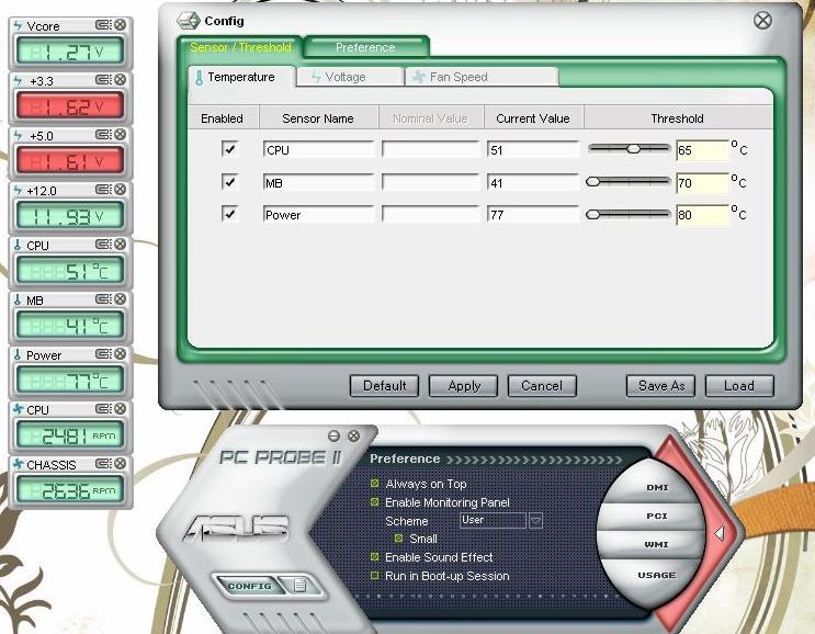Felraktam az asus probe-ot, és egyből szórta is nekem a riasztásokat, hogy ugye túl meleg a proc, továbbá a +3.3V és +5V -os feszen van vmi bibi,mert nagyon alacsonyak.A power-re is elég furcsákat produkál,ugrál egy 40-82-es körzetben. Íme egy screenshot, várom a tippeket mi a fene lehet a gond