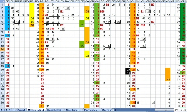 A táblázatomban láthatók számok vastag keretezésben. Ezen a nyerőgépen van egy "dinamit" , ami nagyobb összegű találatot ad.