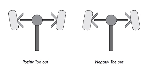 A "toe in" a kerekek felülnézetből látható összetartása. Pozitív, ha a kerekek "eleje" közelebb van egymáshoz, mint a hátsó pontja, és negatív, ha fordítva van (toe out).