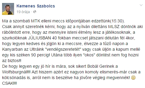 Szakácsként dolgozom egy belvárosi étteremben a betondzsungelben,szerintem nem kell ecsetelnem hány fok lehet a konyhában már reggel 8kor...és valahogy túlélem,és nagyságrendekkel kevesebb pénzért mint amennyiért Kemenesnek kellene kibírnia kétszer 45 percet. És mégse írom ki faszbukkra a világfájdalmam,bár én nem panaszkodok,ezt választottam :) Na off vége ma hajrá Fradi-Loki -