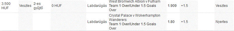 Labdarúgás Crystal Palace v Wolverhampton WanderersTeam 1 Half Time Over/Under 0.5 GoalsOver 1.75 +0.5 Nyertes