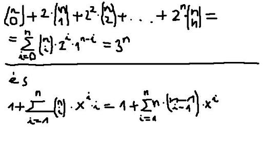(n 0)+2*(n 1)+2négyzeten*(n 2)+...+2 az n-ediken*(n n)=szumma i=0-tól n-ig (n i)*2 az iediken*1 az n-i-ediken=3 az n-ediken.