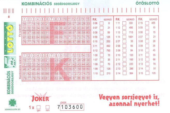 na itt a kombinációs lottó, elmagyarázta a csaj a lottózóban, hogy a fix számokkal azért nenéz játszani, mert ott el is kell találni a számokat, a kombinációssal viszont nagyobb az esély, a szorzó viszont azért van ,hogy ha monnyuk az első 6-os szorzónál jelölsz akkor 6 számot tehetsz, és 6x200 forint az ára, de ha itt van 2-es találatod akkor 6 darab kettesed van!!