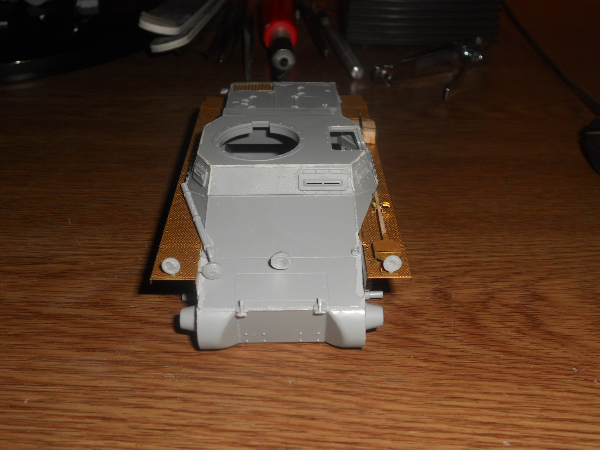 A torony előtti pajzs merevítőit és az MG nyílást ki kellett fúrni.