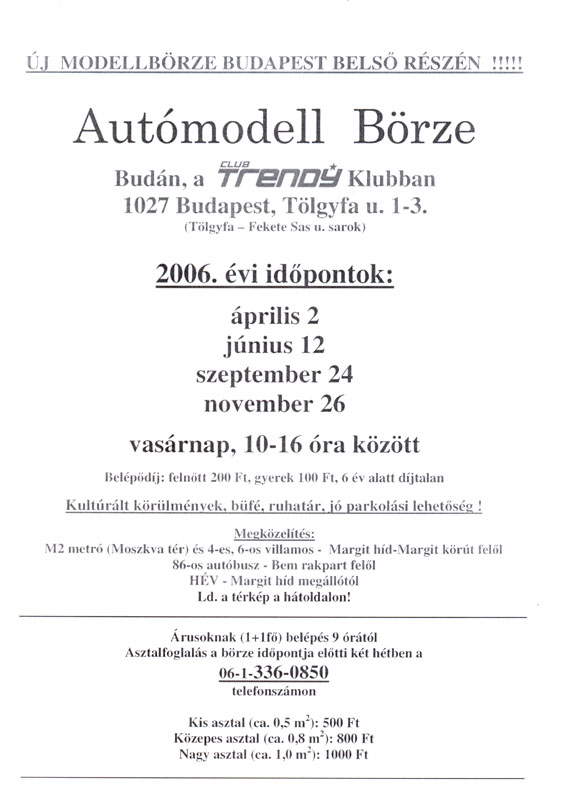 aki autó makettezik és pesti,az jó ha tudja,hogy lesz börze 2 havonta a margit hídtól nem messze! autómodell börze az eredeti neve,de hátha lesznek makettek is...akit érdekel annak itt a szórólap,beszkenneltem: