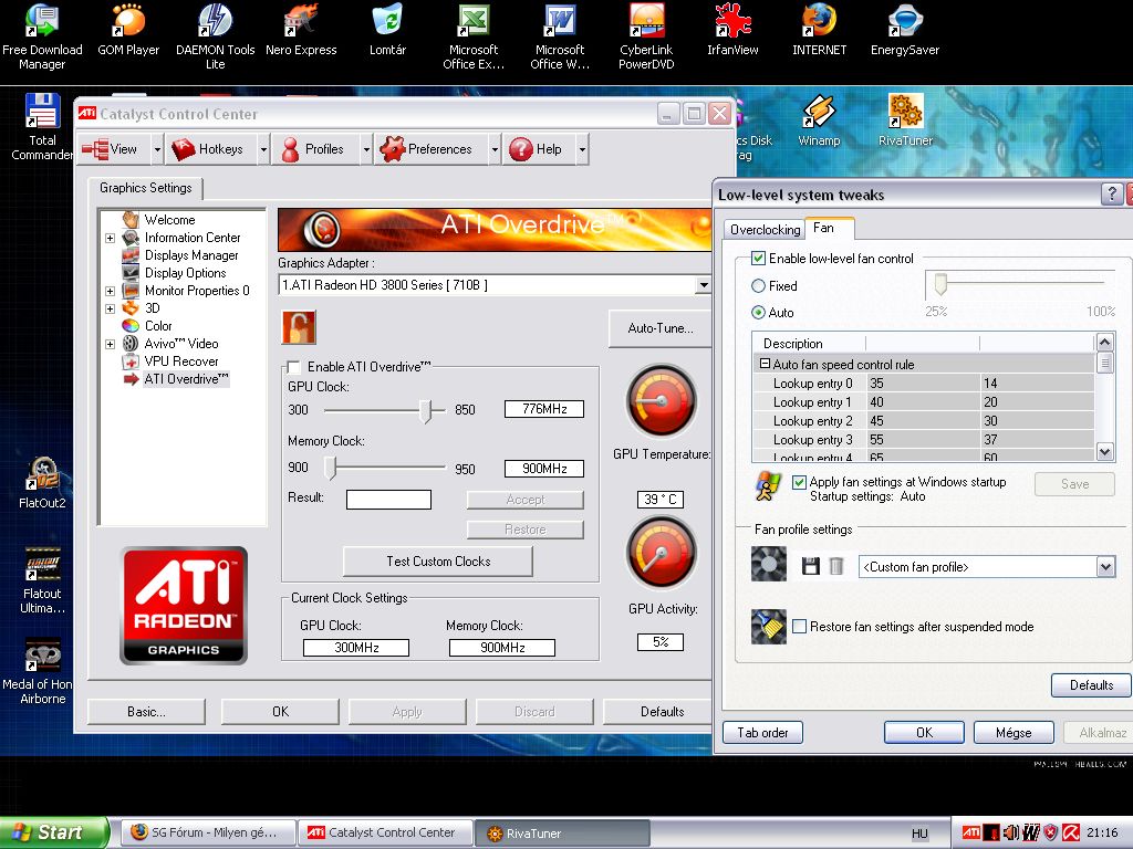 :ÁÁÁ nem tudom mivan a kártyámmal :S A rivatuner szerint folyamatosan ugrál a hőfoka a kártyábak 35 - 38 között, és a hűtő be- és ki kapcsolgat. -