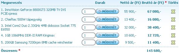 Jah és még hiányzik az alaplap a listáról, arra van úgy 25.000.-em, úgyhogy ha tudnátok ajánlani hozzá egyet, azt megköszönném! Természetesen olyanra lenne szükség, ami támogatja az 1333 FSB-s E6550-et, illetve az 1066MHz-s DDR2-t. -