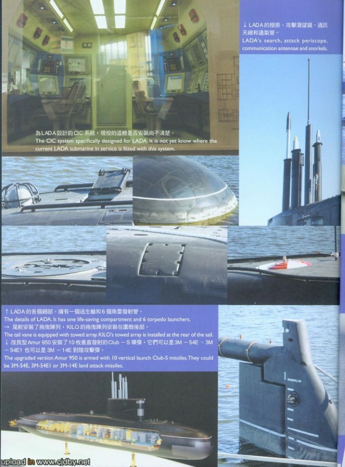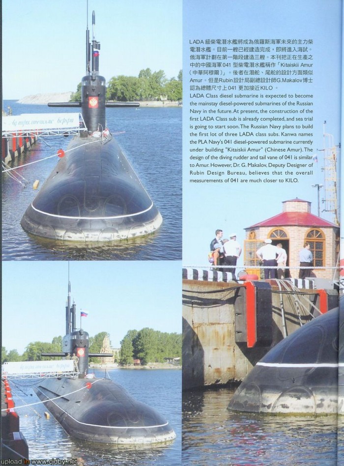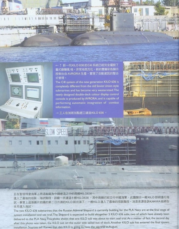 Scannek egy kínai újságból. Az elsőn az orosz 636-os (NATO: Kilo) osztályú diesel-elektromos tengeralatjárók kínai rendszeresítéséről, új, teljesen digitális fedélzeti rendszereiről írnak. A maradék négy az új Lada/Amur osztályú orosz diesel-elektromos tengeralattjáróról szól. A cikk szerint három egység gyártása már biztosra vehető, és a jövőben ez a típus fogja kiváltani a régebbi, szovjet-éra beli hagyományos meghajtású vadásztengeralattjárókat. Ezen meglepődni ugye nem kell, hiszen nemrég bejelentették, hogy oroszország az elkövetkezendő években évi mintegy 20 milliárd dollárt költ majd új fegyverek beszerzésére.