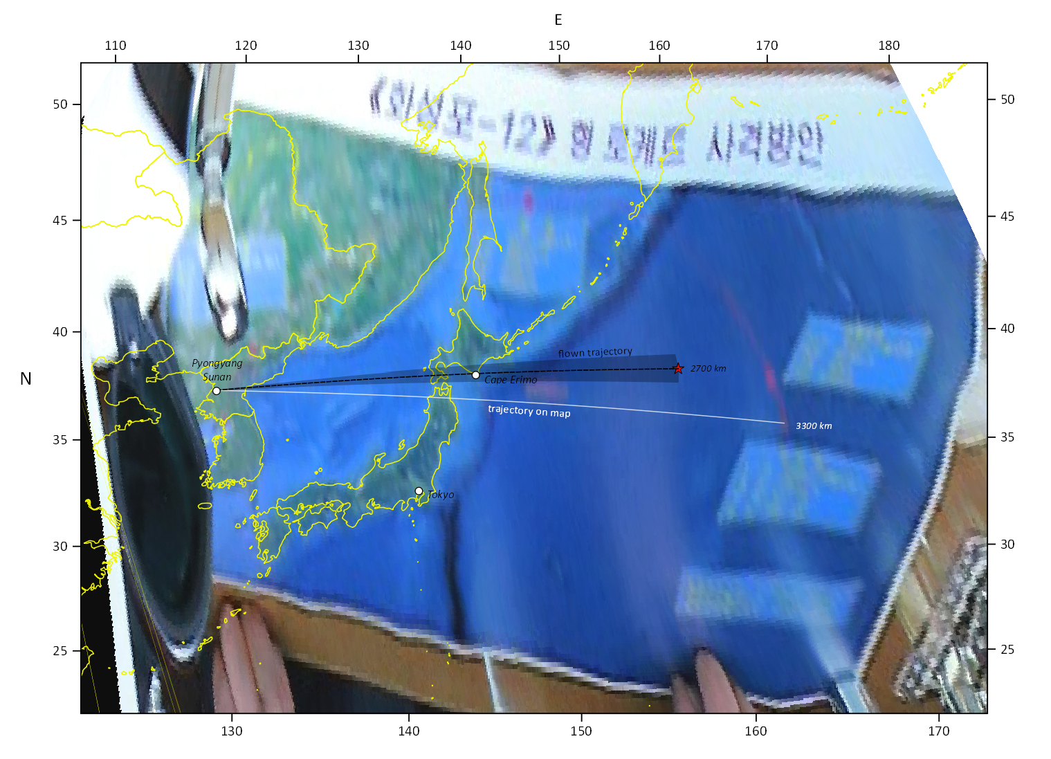 Lehet látni, hogy Észak-Korea eredetileg egy ~3300km-es hatótávolságú rakétatesztet szeretett volna végrehajtani, de végül cirka 600km-el rövidebb lett, ráadásul elég jelentősen eltért a tervezettől kereszt irányban is, mivel mintegy 150km-el északra csapódott a tengerbe.