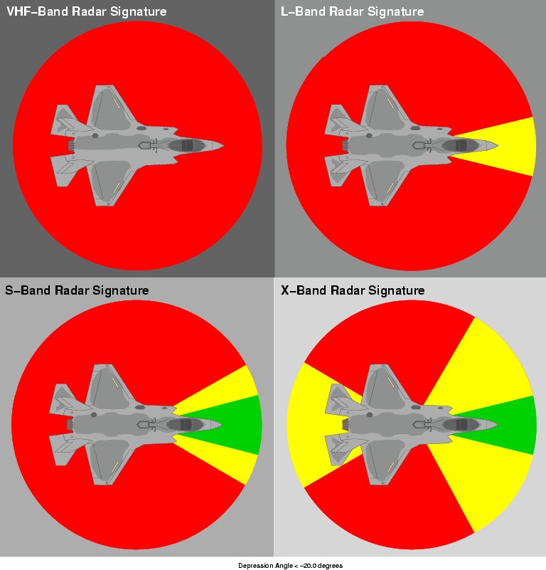A négy ábrán az F-35-ös látható, és az, hogy amíg X- és S-hullámhosszon szemből még elég jól szórja szét a beékező radarjeleket, addig L-hullámhosszon már alig-alig, VHF hullámhosszon pedig egyáltalán nem. Az is érdekes, hogy hátulról csak az X-hullámhossz esetében szerepel jól. -