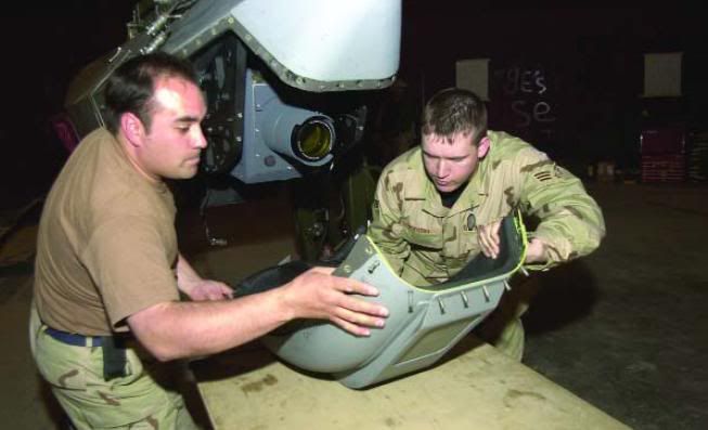 April 23, 2004, issue: Staff Sgt. Daniel Hernandez and Senior Airman Chett Tyson, both with the 107th EFS, disassemble part of a TARS optical sensor pod from the F-16 for routine maintenance in a HAS. (USAF photo by Maj. Charles Anthony)