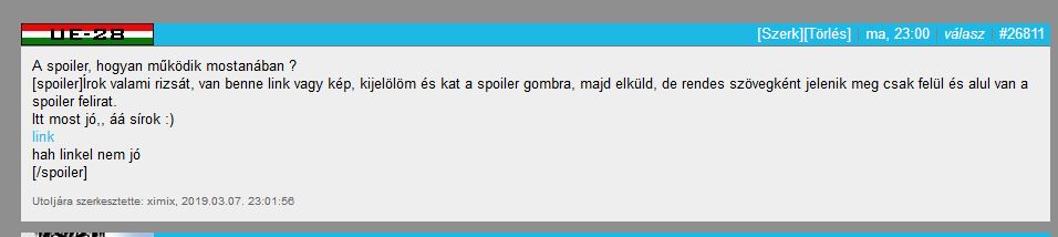 SPOILER! Kattints ide a szöveg elolvasásához!Írok valami rizsát, van benne link vagy kép, kijelölöm és kat a spoiler gombra, majd elküld, de rendes szövegként jelenik meg csak felül és alul van a spoiler felirat.