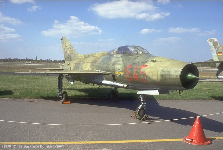 Egy viseletes egykori kelet-német MiG-21F-13, látható a nagyobb függőleges vezérsík, és megváltoztatott kabintető. -