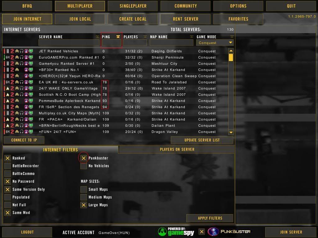Bejelentkezés után balra fent a MULTIPLAYER feliratra kell kattintani, akkor egy ilyesmi ablak jelenik meg. Itt a JOIN INTERNET fülön belül választhatod ki a szervert. Javaslom, hogy előtte rendezd PING szerint növekvő sorrendbe a szervereket és csatlakozz ahhoz, amelynek alacsony a pingje, de nem nulla! Ha kiválasztottad a szervert rákattintasz a nevére, majd a JOIN SERVER feliratra jobbra lent. Aztán