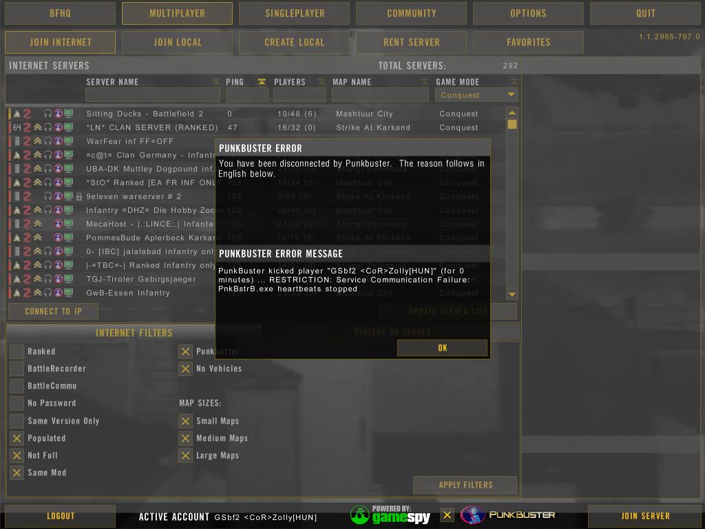Csak mert elég pofátlanok voltak. Megkérdem a battlerecordert, válasz nincs, szerver leállítása elött pár másodpercre azért beirták hogy hahaha. Majd mikor páblik lett, felakartunk oda menni, és kettőnket ezzel a hiba üzivel basztak ki. Ez még jobb, mikor komanderként hasaltam egy bokor közepén, és bánihop miatt basztak ki. :)
