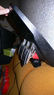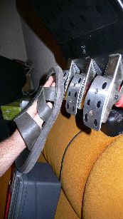 Amugy nekem a G25 pedal most lefejjel nagyon bejon a cockpiton, nekem jobb mint elotte a foldon (mikor meg nemvotl cockpitem), de ezeket mar reszletesseben leirtam lejjeb, hogy neirjam ugyanazt ott megtalalod. Csak anyit tennek hozza hogy nekem nincs az a erzesem hogy mintha rovidebb palyan menne a pedal lefejjel. De hozzateszem, en amiota G25 van mindig cipobe vezetek (nem bakancs!, finom puha talpu cipo, igaziba is azzal kenyelmes a vezetes). Es mikor autocadba terveztem a cockpitot es a G25 pedal felfuggesztest akkor en is kb olyan szogbe terveztem/rajzoltam be mint a Pointer tartja a kepen. Ugy felszereltem es rajottem hogy nemjo. Kenyelmetlen volt a lenyomasa, es nagyon be kellet nyomnom. Aztan addig allitgattam meg eljutottam majdnem szinte fuggoleges poziciohoz, es ugy most a legjobb. A fuggolegestol csak egy picit van megdontve, es meg magassabra is elemeltem mint eredetileg gondoltam, de az lehet abbol fakad hogy nagyon nagy labu vagyok (12). kb olyan 65-70 fok lehet a 90-bol. Igy most nagyon jo taposni es kenyelmes, de meg nem volt lehetosegem kiprobalni a heel&toe technikat, mert most mindig GTR futamok vannak, es ilyenkor ha sekvencialis valtos kocsi van, akkor leveszem a kuplungot es balra tolom a pedalokat hogy a fek a bal labnak paszoljon es a gaz meg a jobb labnak. Ezert akartam nagyon alithatosnak, mert normal kuplungos kocsinal meg felteszem a kuplungot es jobra tolom a pedalokat hogy ballabnak csak a kuplung legyen es joblabnak meg a gaz/fek. Szoval meg nemvolt idom kuplungos kocsit tesztelni, de mikor meg a foldon volt akkor a heel&toe technika nagyon nemment nekem, sose talaltam el a pedalokat ugy ahogy kellet volna. Majd meglatjuk hogy milyen lesz most fentrol. -