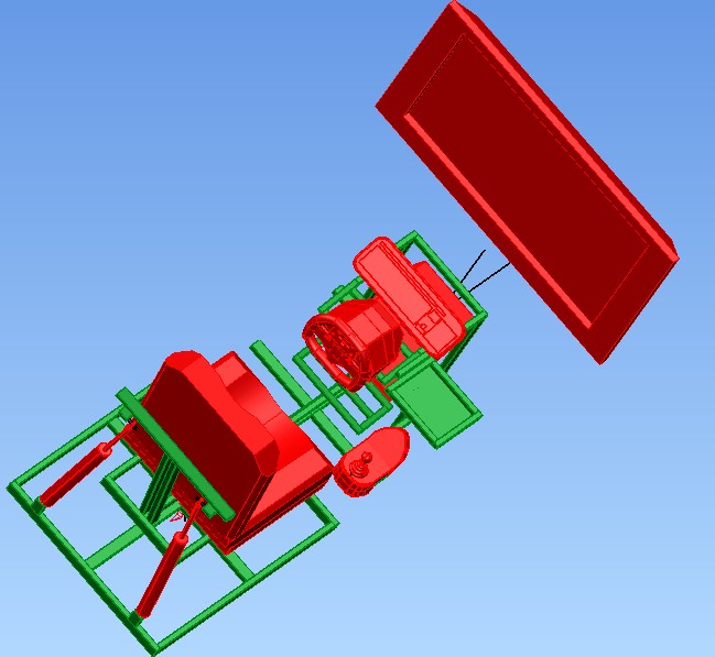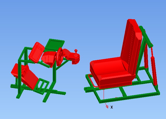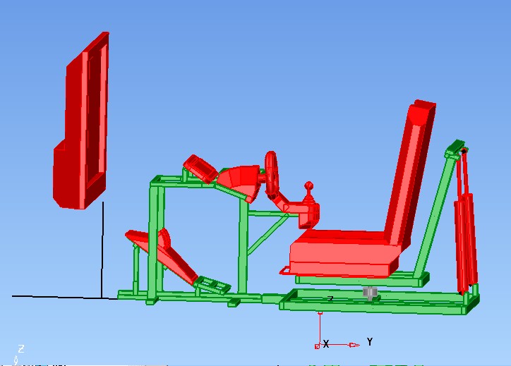 Az ateuátort meg a csuklót nemtom milyen lesz, azt csak úgy csináltam. Az ülés kb méret, A kormány, pedál váltó, az jó távba van, kényelmesen. A TV meg az 50" méret, ami elé tolva akarod. Szétszedhető, de még sok mindent levehetünk meg felrakhatunk. Soká lesz a műhelyben jó idő :S :D .