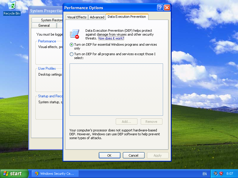 On my other machine I have turned DEP for essential services only and I didn't experience any problem there."