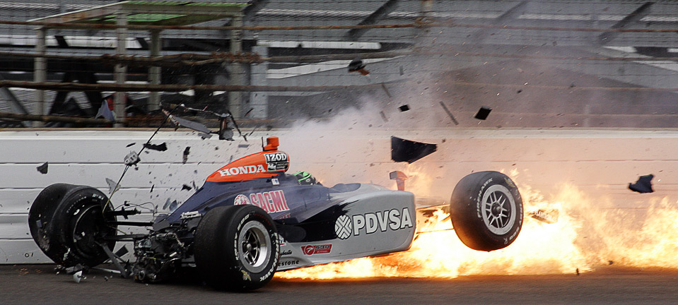n003 #9469 E.J. Viso hits the wall in the first turn during practice for the Indianapolis 500 auto race at Indianapolis Motor Speedway in Indianapolis May 18.