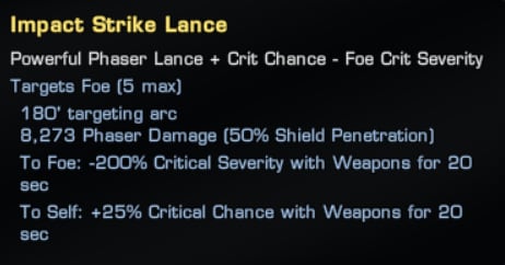 The Impact Strike Lance uses subtle modifications of standard Phaser energy and hits with such a resounding punch that it penetrates the enemies shields by 50% and disrupts enemy tactical systems. Increasing your Critical Chance and reduces the impact of your enemies Critical Hits for a few seconds.
