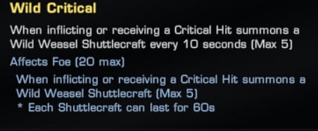 Every Critical you receive or apply to or from an enemy every 10 seconds summons a Wild Weasel Shuttlecraft to assist and these craft will remain in the combat zone for 60 seconds and then warp out once their action is complete.