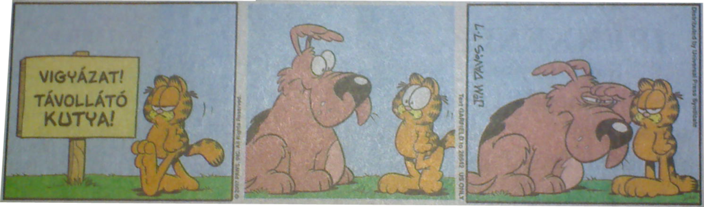 :D Ha elég tökös lenne Jim Davis, egyszer megléphetné azt, hogy egy héten keresztül minden kockában az alábbi képsor második képe szerepel, és csak a vasárnapin eszi végül meg. -