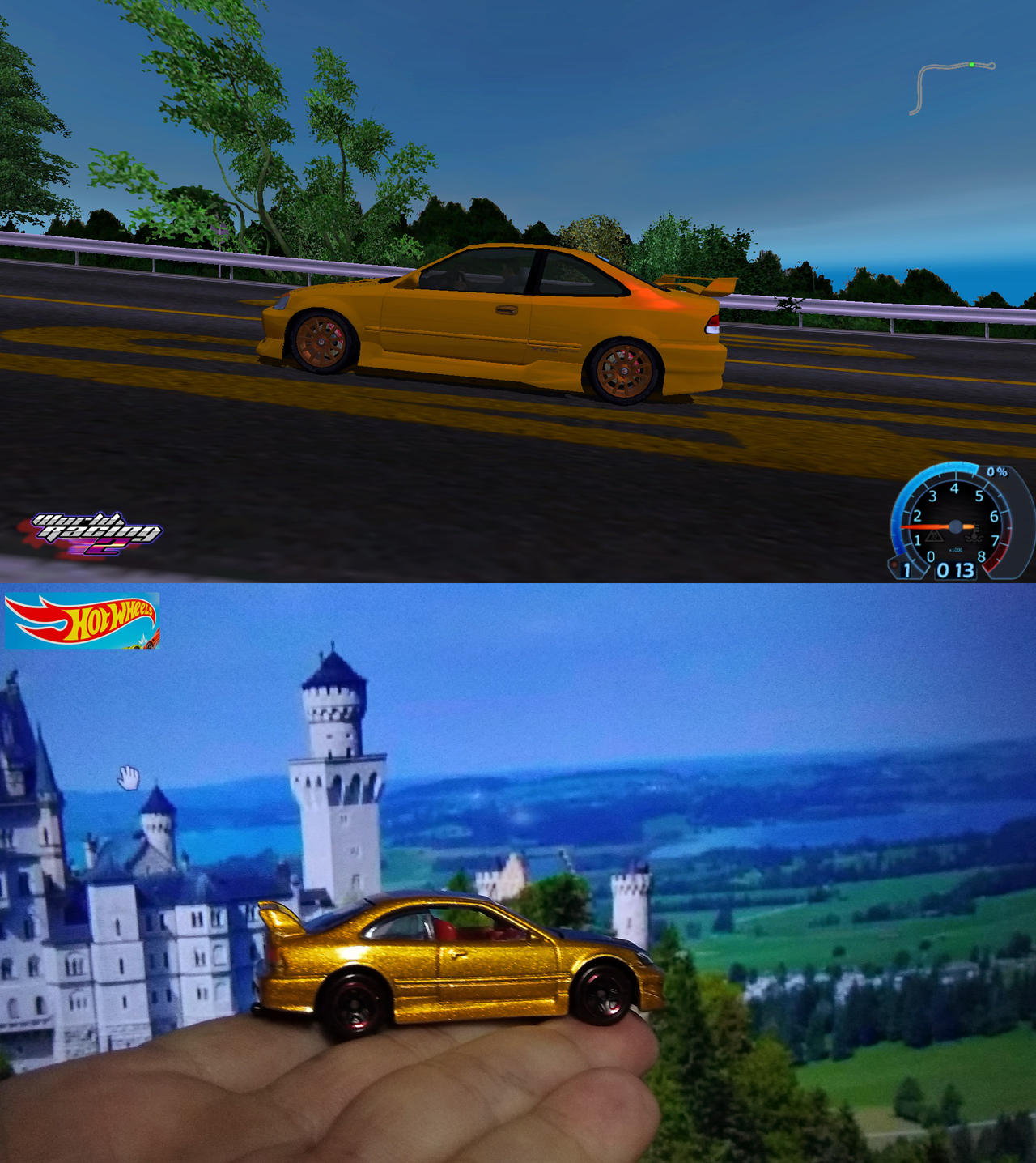 Egy érdekesség 2024-re: kiadták azt a Honda Civic Si-t ~ Hot Wheels Imports kiadásban idén, amit még Kálmánnal áttettünk Need for Speed-ből, de nem csak a kialakított forma hanem még a felni szín is egyezik :) Annyi csak a különbség, hogy nálam meg felső lakkréteg pirosan csillogó, az alapszín arany és a Brembo fékek is pirosak, ők meg arany felnit piros csíkkal nem tudnak kiadni, vagyis a kettőt nem tudják kombinálni. Összességében tényleg egyezik a WR2-essel :D Várom mik lesznek még, ezt megvettem gyorsan azért XD