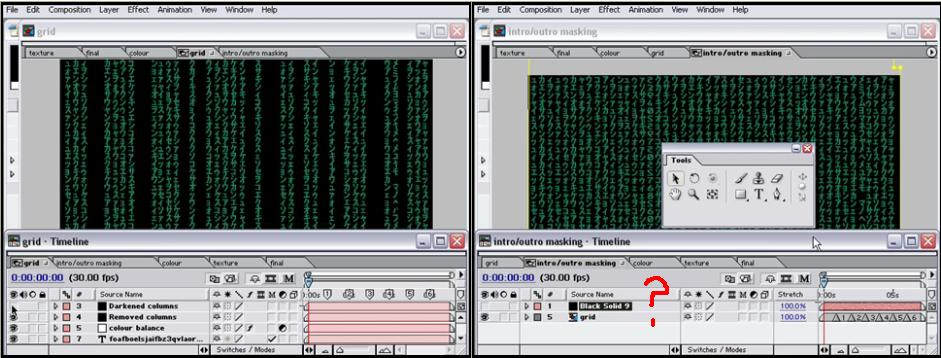 nah help megint. elkezdtem a matrixos hatást csinálni, de elakadtam, mert va egy olyan rész, mikor egy új compositiont hozunk létre, és nálam nem látszódik az előző fül tartalma, vagyis a zöld kódok, hanem egy nagy feketeség van. nála is feketeség van ha láthatóvá teszi azt a black solid réteget, viszont most nem látható, így látszódik az előző rétegen lévő sok zöld kód(igaz a képen vannak rajta lyukak az csak azért mert az első képet hamarébb csináltam, később meg kikapcsolta azokat arétegeket amikkel csinálja ezt)