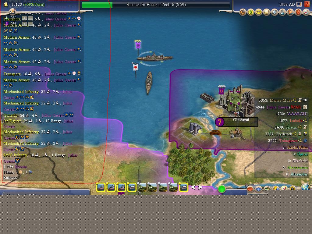 A legjobban mégis az tetszett az egész játékban, amikor a végén visszanéztem az ismétlést. Szép komótosan, a rómaiak elleni kisebb háborúkkal (Caesar kezdte) növekedtem, aztán egyszer csak lavinaszerűen eltűnt az egész amerikai birodalom. Az elsőnek elfoglalt városok még éppen csak abbahagyták a lázadást, amikor már nem volt több kék terület a térképen. Utólag megszámoltam: az egész háború a hadüzenettől a kiirtásig 9 körig tartott. Ezalatt elbuktak egy egész kontinenst 10 méretes várossal. Pedig előtte a második legtöbb pontjuk volt, Catherine után. A lenti kép kistérképén a job felső sarokban található kontinens volt teljesen az amerikaiaké. Végül szép fehér lett az egész. -