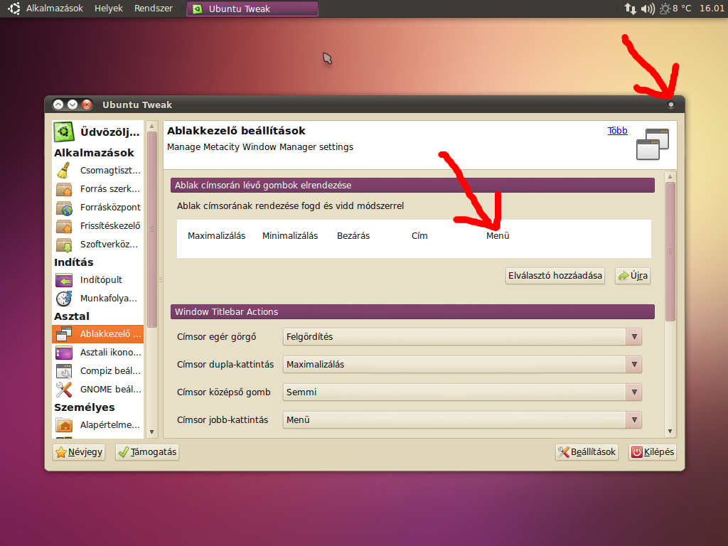 Másik kérdésem, hogy ubuntu-tweak ablakkezelőben rányomtam hogy "újra" gombra, innentől fogva az olyan témánáknál is ott az ablak menű gomb amik alapból nem rakják ki és nem tudom eltüntetni (konkrétan a Dichotomy téma).