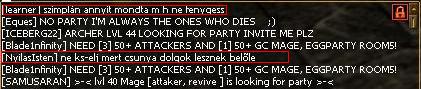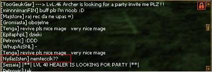 Az egész ott kezdődött, hogy volt 1 kis partym, amivel betértünk d1 r4be, ahol épp folyt 1 nagyobb party is a szoba közepén. Öltünk öltünk, ők KS-eltek, mi tűrtük, mire az 1ik party member kitalálta h akkor ks-eljünk vissza. Mivel láttam h van magyar is a nagyobb partyban, úgy döntöttem h inkább nem, próbálok szólni a többieknek h ez nem jó ötlet. A többiek természetesen tartották magukat ehhez az ötlethet, elkezdtek visszaKS-elni, aminek következtében NyilasIsten odajött és megfenygette a partyt, hogy ne KSeljünk mert meghalunk... Odamentem hozzá, mondtam neki h legyen szíves ne fenyegessen, erre megint beszól hogy ne ks-eljek mert csúnya dolgok lesznek a végén. Természetesen mondtam neki még1szer hogy ne fenyegessen... Nem sok idő múlva ez a party kiment a teremből, a kis partym és jómagam maradtunk bent továbbra is ölni. 1szer csak látom h NyilasIsten rohan a terembe, nyakán kb 10 doggebi, elkezd körbe-körbe szaladgálni és a teremben levő bugok miatt, mind a nyakunkon maradt, és csak annyit vágott oda nekem hogy: "na mivan, nemteccik?"