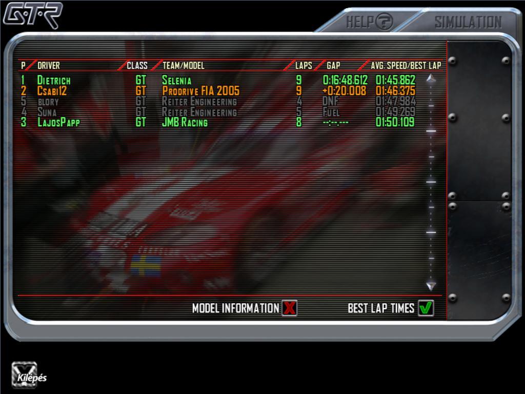 Még abban a körben utolérem 1 mp-re de nekem váratlanul kihúz a boxba elöttem így megint én vagyok az első és marad is így.