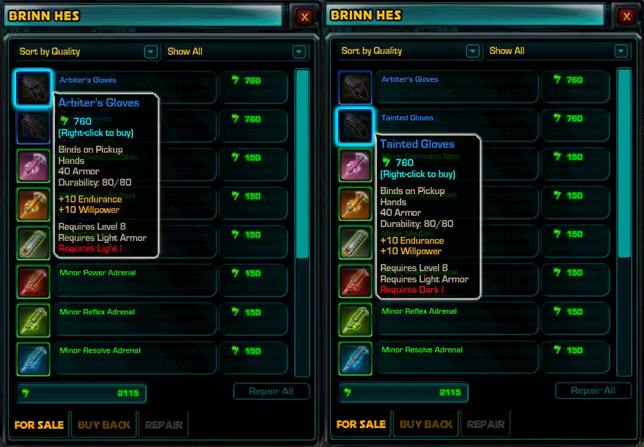 kis szintű tárgyakról tudok nyilatkozni, azoknál nincs eltérés kinézetben sajnos (tehát egy dark sith assassin kb. ugyanúgy néz ki, mint egy light sith assassin)