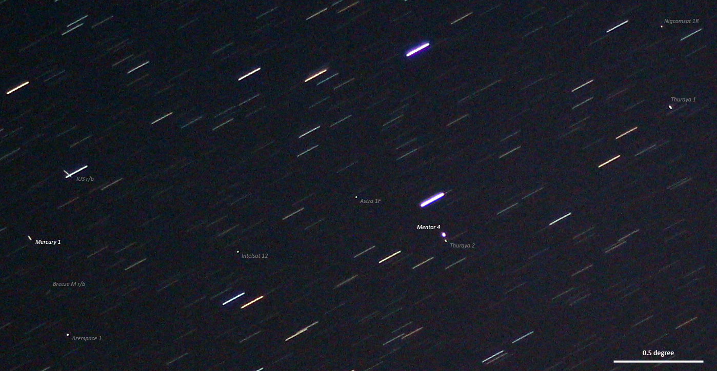A Mentor 4 és egy másik GEO pályán keringő műhold egy képen, látványos, mennyivel fényesebb a kémműhold (ie.: nagyobb és több fényt ver vissza)